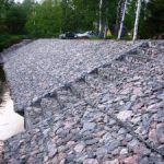 Следващият важен момент ще бъде получаването на кутии. Габионите не изискват основи, достатъчно е земята под тях да се трамбова. След това ги поставете на окото и ги свържете в единна структура със здрава стоманена тел. За да се избегне деформация на конструкцията може да се укрепи през първата година с дървени кофражи. Въпреки това, строителството с габиони може и без тях, необходимо е само да свържете достатъчно здраво стените с тел по време на пълнене. Остава само да се определи материала и започнете пълненето. За каменните габиони може да използва почти всичко: естествен или натрошен гранит, пясъчник. Ако габиона е декоративен, можете да го напълните с цветни камъни.