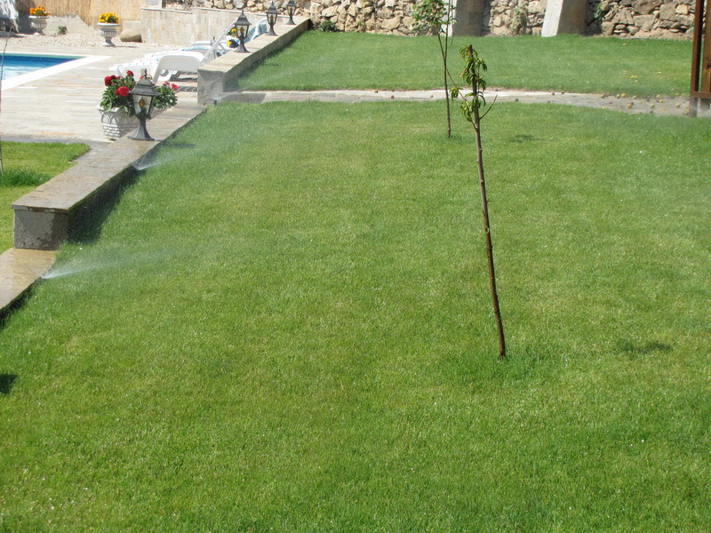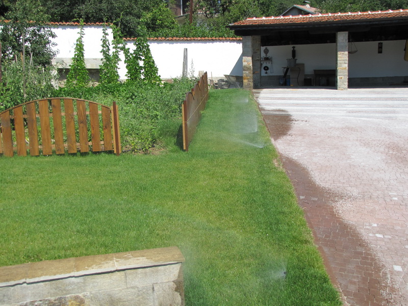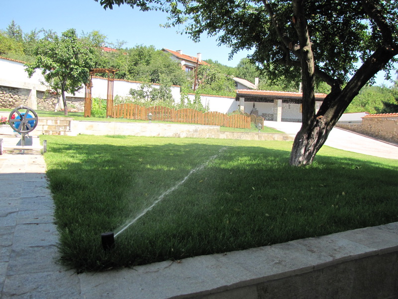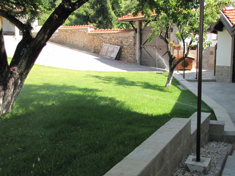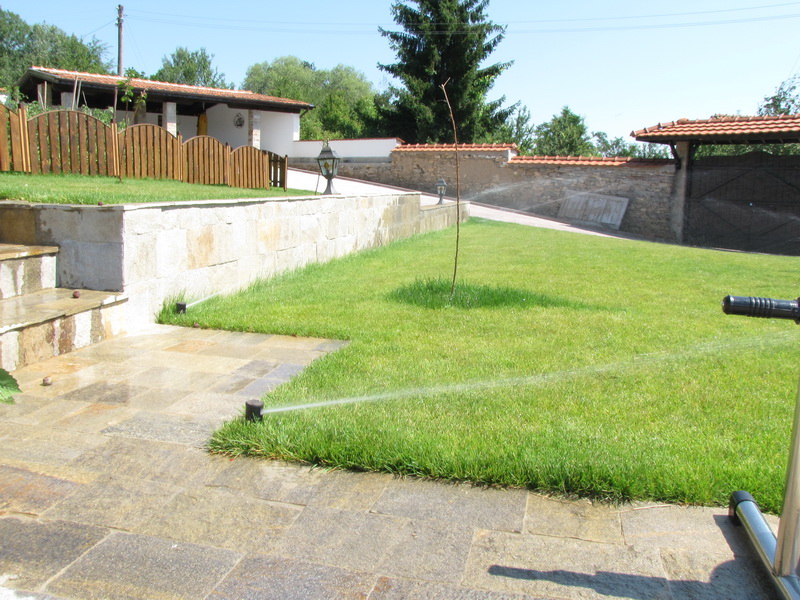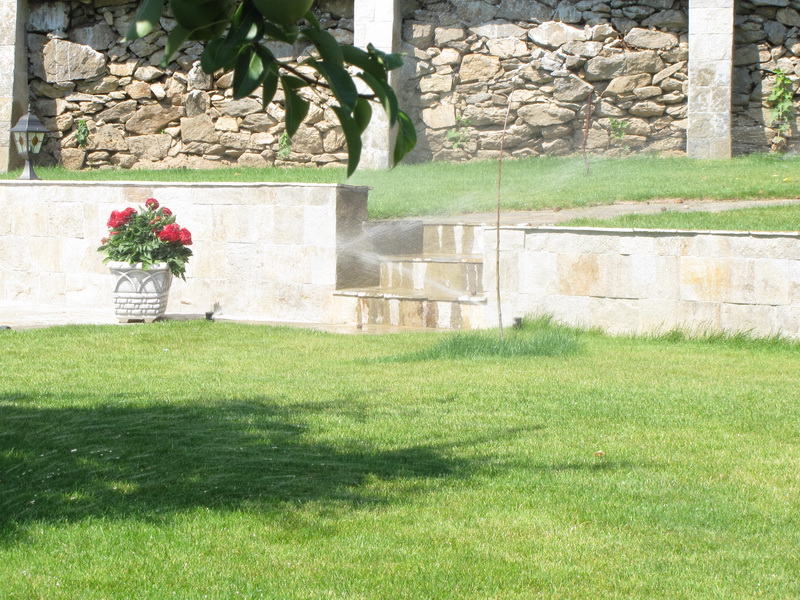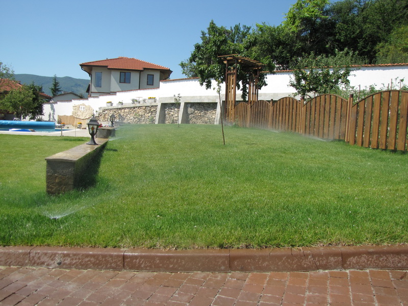 След завършване на строителните дейности по басейна и терасиране на горните нива на терена изградихме останалата част от поливната система. Поливна система с материали на Hunter industries. Използвани са роторни разпръсквачи “SRМ” и “PGP”, както и дефлекторни разпръсквачи тип спрей. Програматорът е “X – Core” с 6 станции за външен монтаж, а електромагнитните клапани “PGV”. Системата се захранва от собствен водоизточник с потопяема помпа “ZDS” с разширителен съд 60 л. и механичен пресостат, пускател Schneider Electric. Предвидено е капково напояване на зеленчуков сектор.