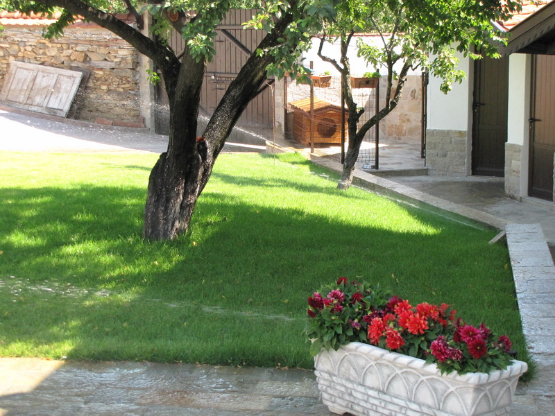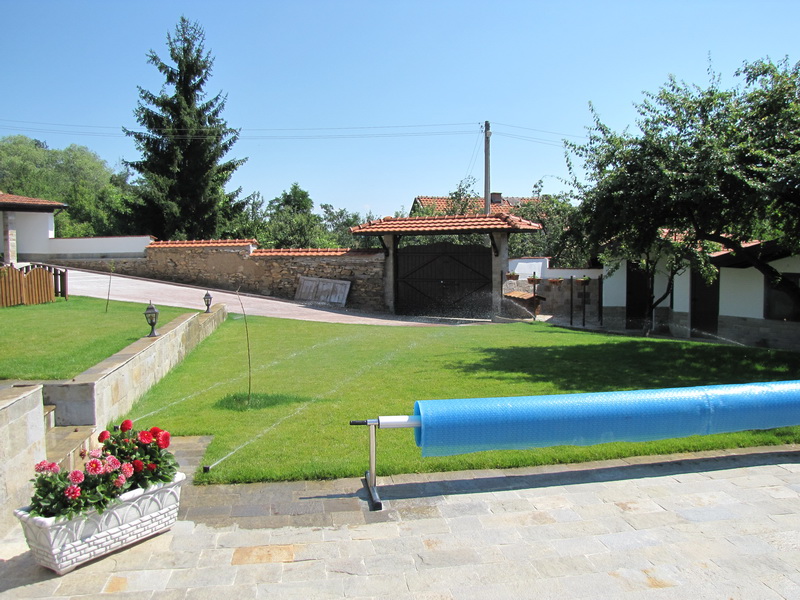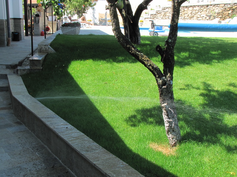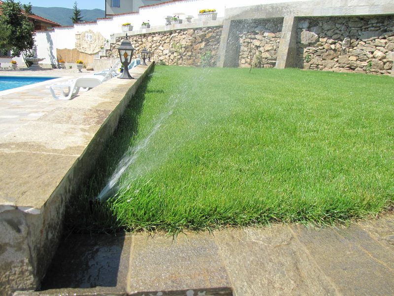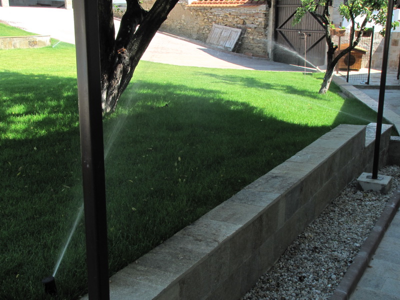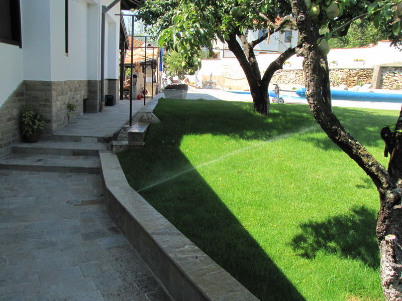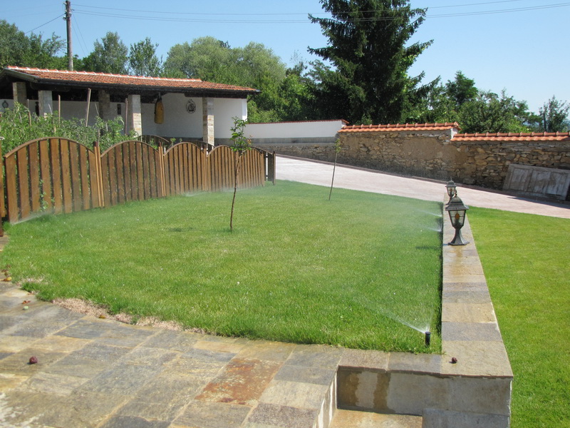 След завършване на строителните дейности по басейна и терасиране на горните нива на терена изградихме останалата част от поливната система. Поливна система с материали на Hunter industries. Използвани са роторни разпръсквачи “SRМ” и “PGP”, както и дефлекторни разпръсквачи тип спрей. Програматорът е “X – Core” с 6 станции за външен монтаж, а електромагнитните клапани “PGV”. Системата се захранва от собствен водоизточник с потопяема помпа “ZDS” с разширителен съд 60 л. и механичен пресостат, пускател Schneider Electric. Предвидено е капково напояване на зеленчуков сектор.