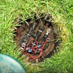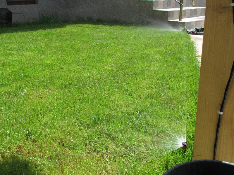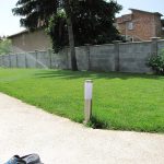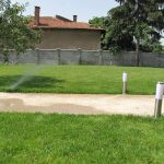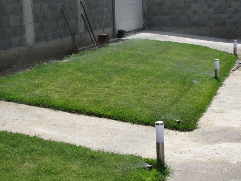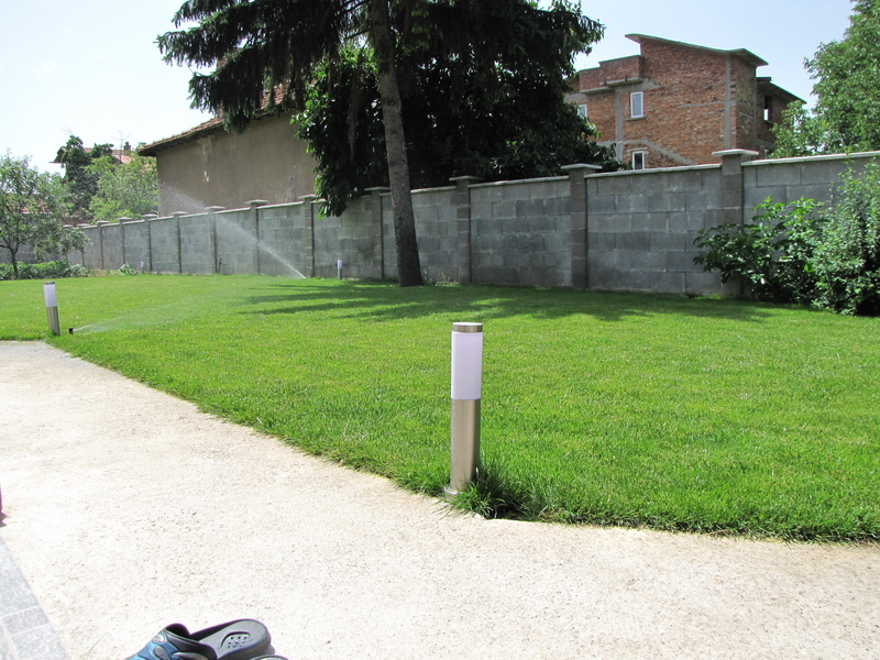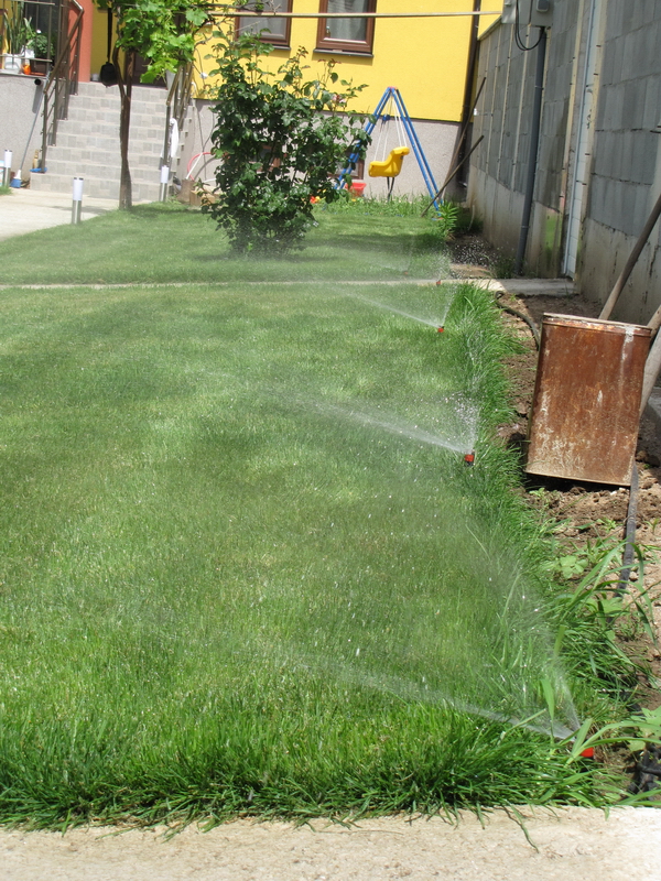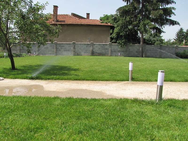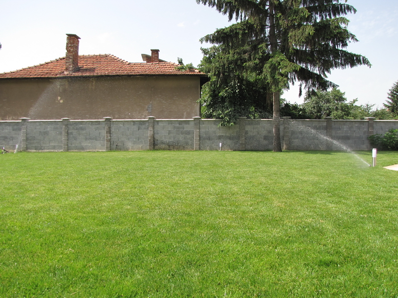 Системата се управлява от програматор за външен монтаж “XC” с 8 станции. Тревните площи се напояват с роторни разпръсквачи PGJ и дефлекторни разпръсквачи PS Ultra с регулируеми дюзи. Помпеният блок “Speroni” черпи вода от кладенец. Предвиден е извод със спирателен кран за ръчно напояване на малък зеленчуков кът.