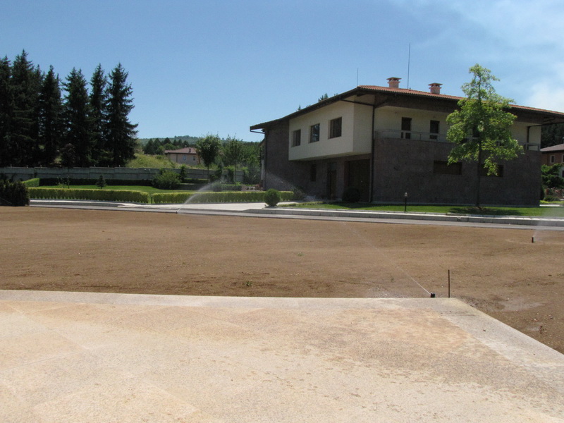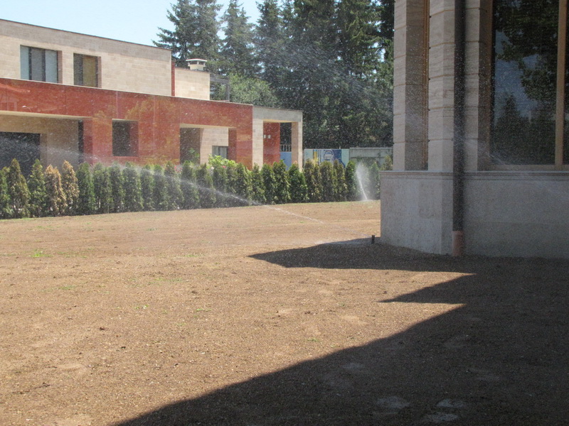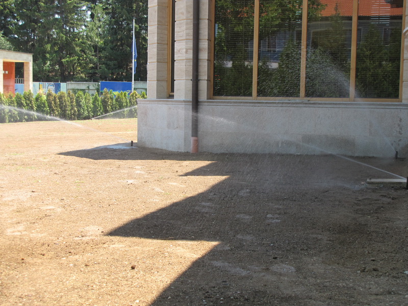 Автоматизирана поливна система захранвана от сондаж намиращ се в двора чрез потопяема помпа Grundfos. Използвани са роторни разпръсквачи на “Rain bird” – модели 3500 и 5004 както и разпръсквачи на “Hunter” – Pro spray с дюзи MP Rotator. Филтърът е мрежест, 2 цола, на Amiad.
