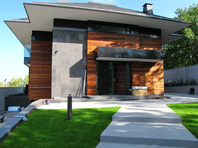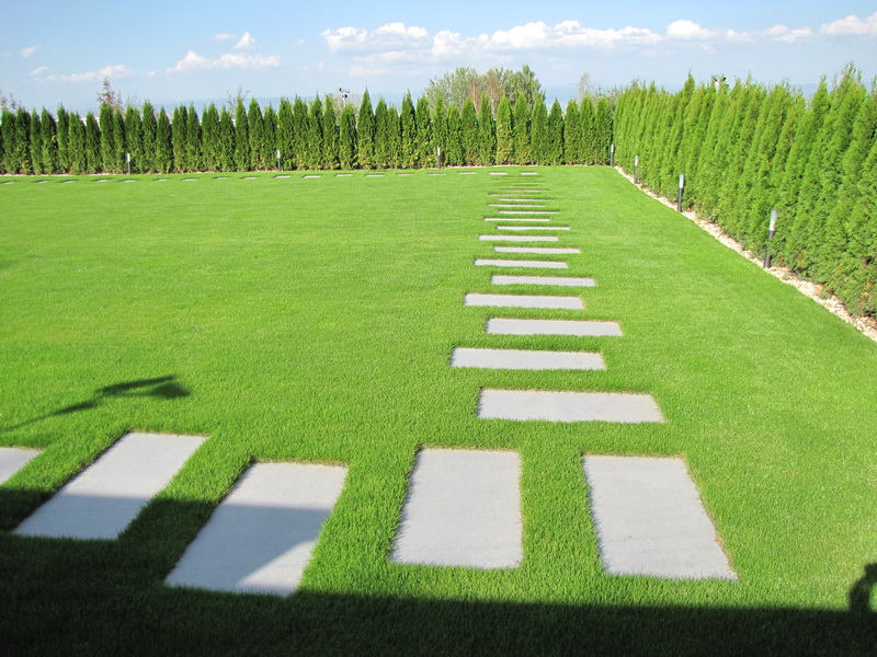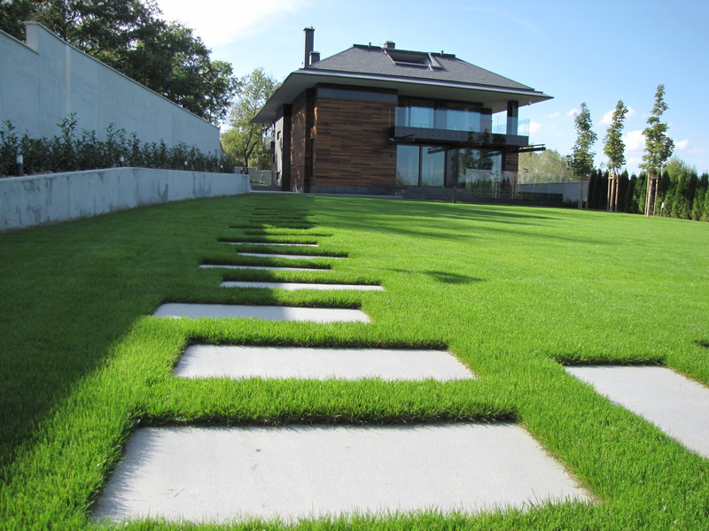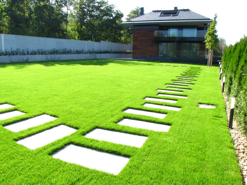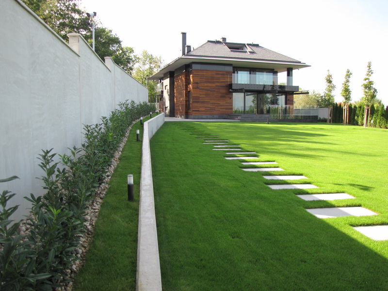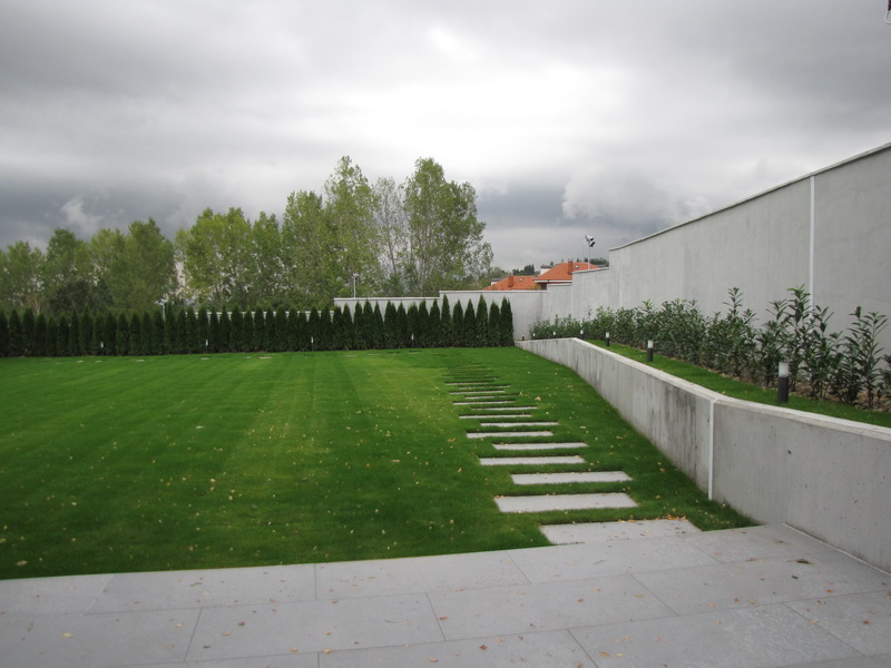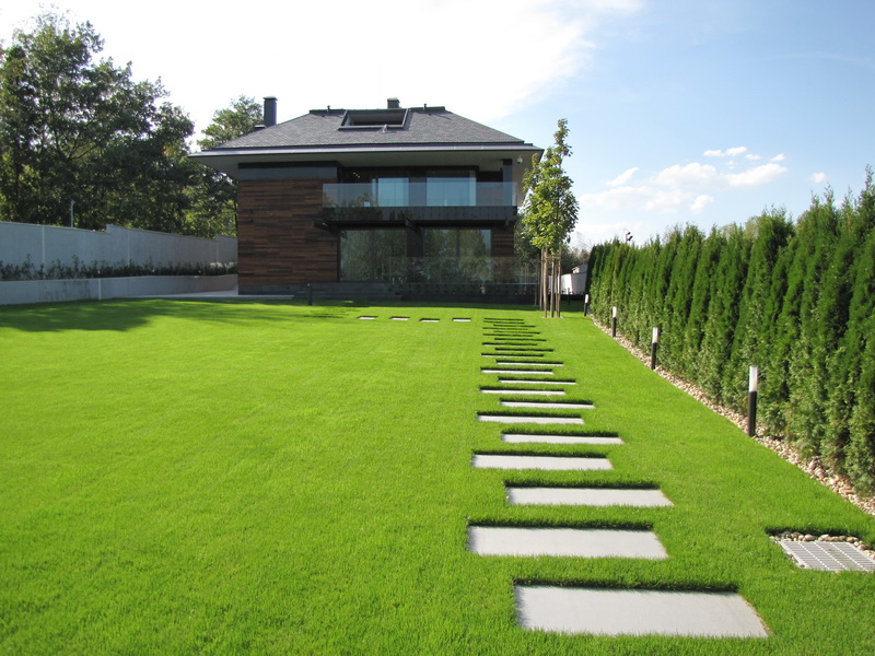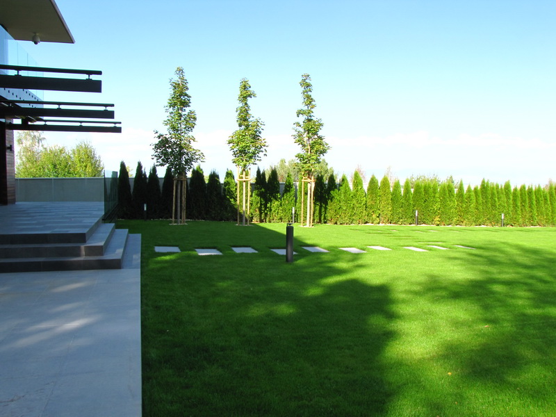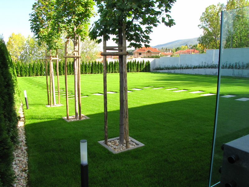 Озеленяването на двора е изключително изчистено и семпло. Тревните площи са изградени с готови тревни чимове. Покрай оградата е засаден жив плет от Thuja occidentalis ‘Smaragd’ и лавровишна. Плочопътеката е от гранитогрес с плочи 60/120 см. Засадени са и три дървета Acer platanoides.