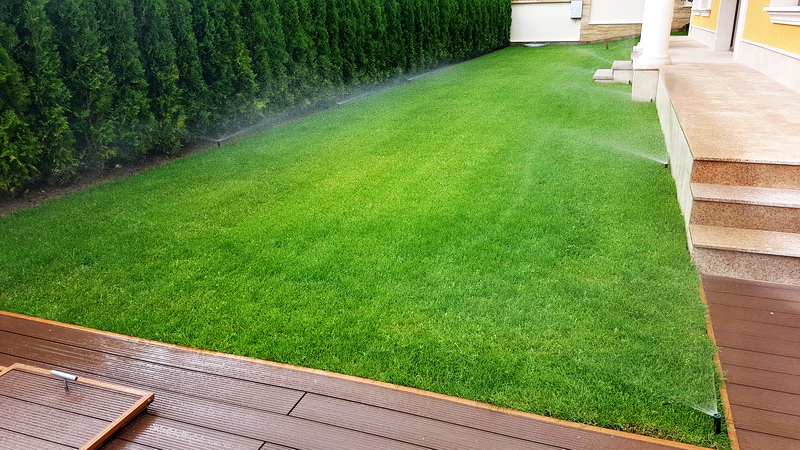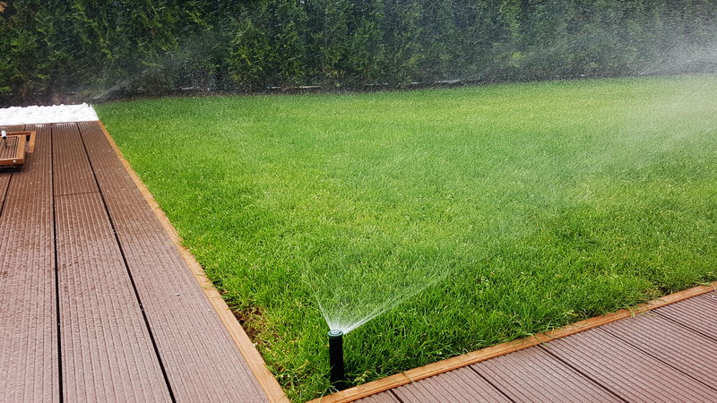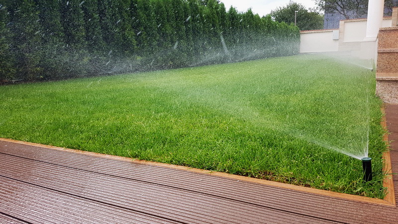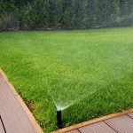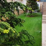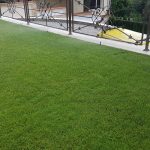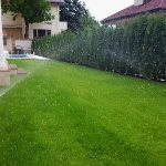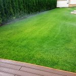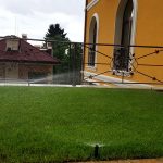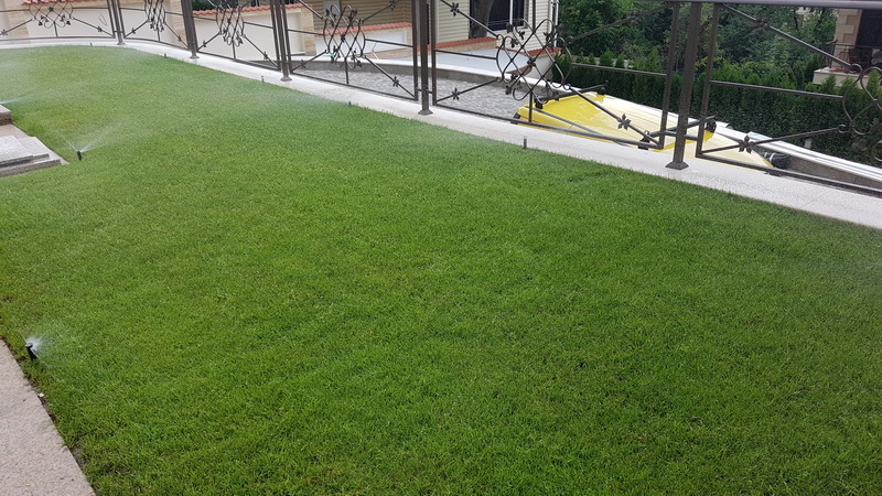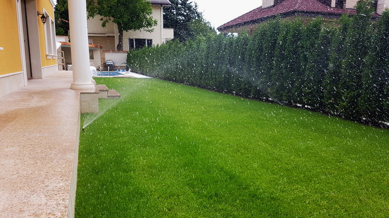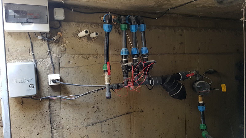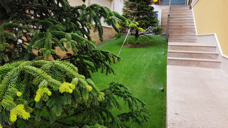 Поливна система на двор в Бояна. Използвани са разпръсквачи Pro spray със стандартни спрей дюзи. Системата се захранва от потопяема помпа за кладенец Scuba на Lowara с флуд контрол на Grundfos PM-1. Програматорът е XC на Hunter.