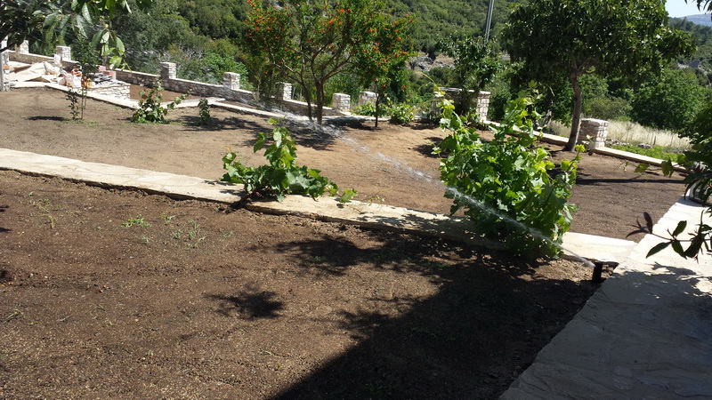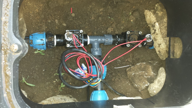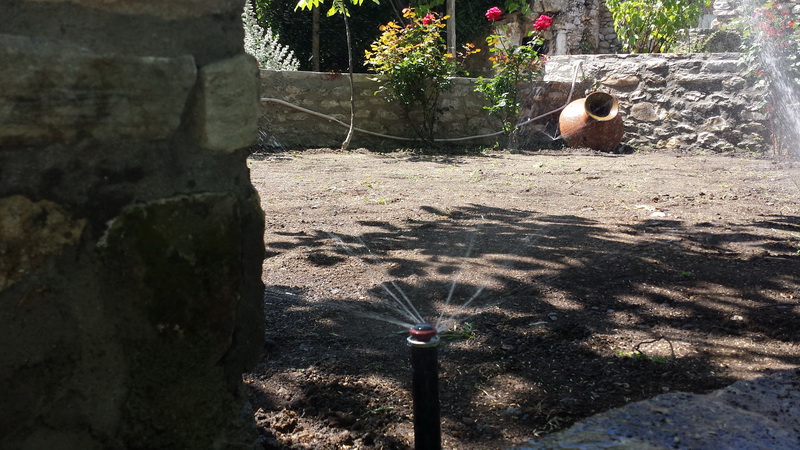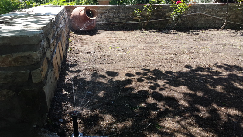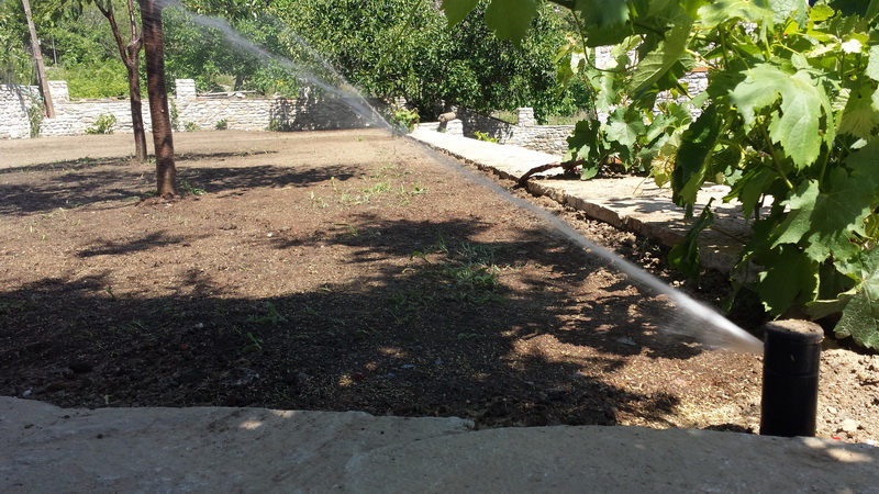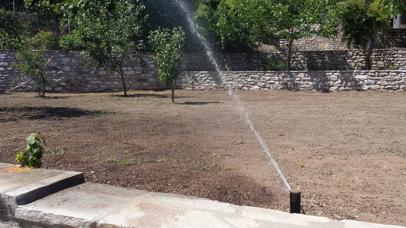 Напояване на новоизградени зелени площи към малък комплекс от къщи за гости. Монтирали сме два резервоара по 1 м3, които се пълнят от водопровода. Помпата която сме сложили е Speroni с флуид контрол на Grundfos. Контролерът е XC на Hunter. Роторните разпръсквачи са PGP, SRM и Pro-Spray с дюзи MP Rotator. имаме и няколко кръга със спрей дюзи. Електромагнитните клапани са PGV-100G-B.