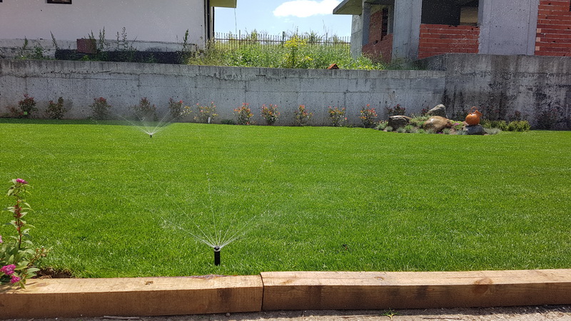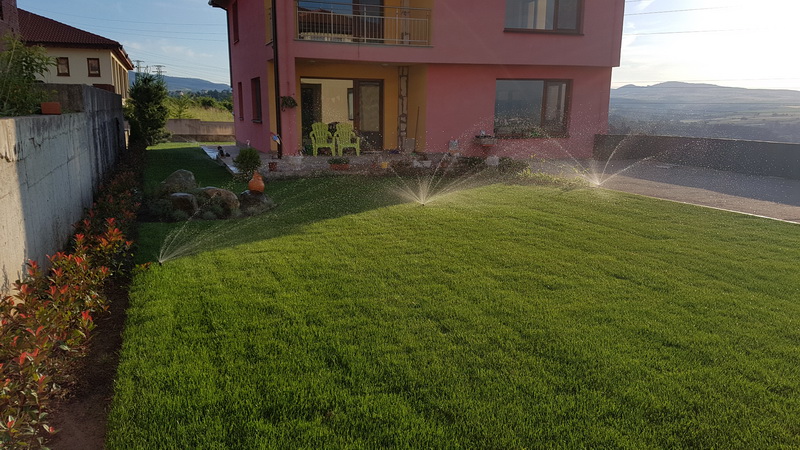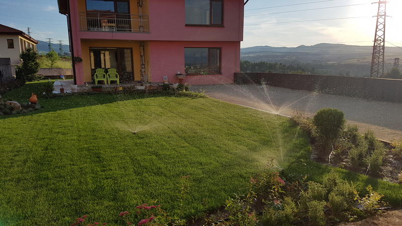 Поливна система на две къщи в затворен комплекс с общ двор между тях. Използвали сме продуктите на Hunter. Разпръсквачите са Pro-spray с MP Rotator дюзи. Системата се захранва от водопровода.