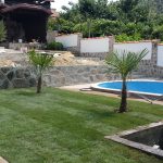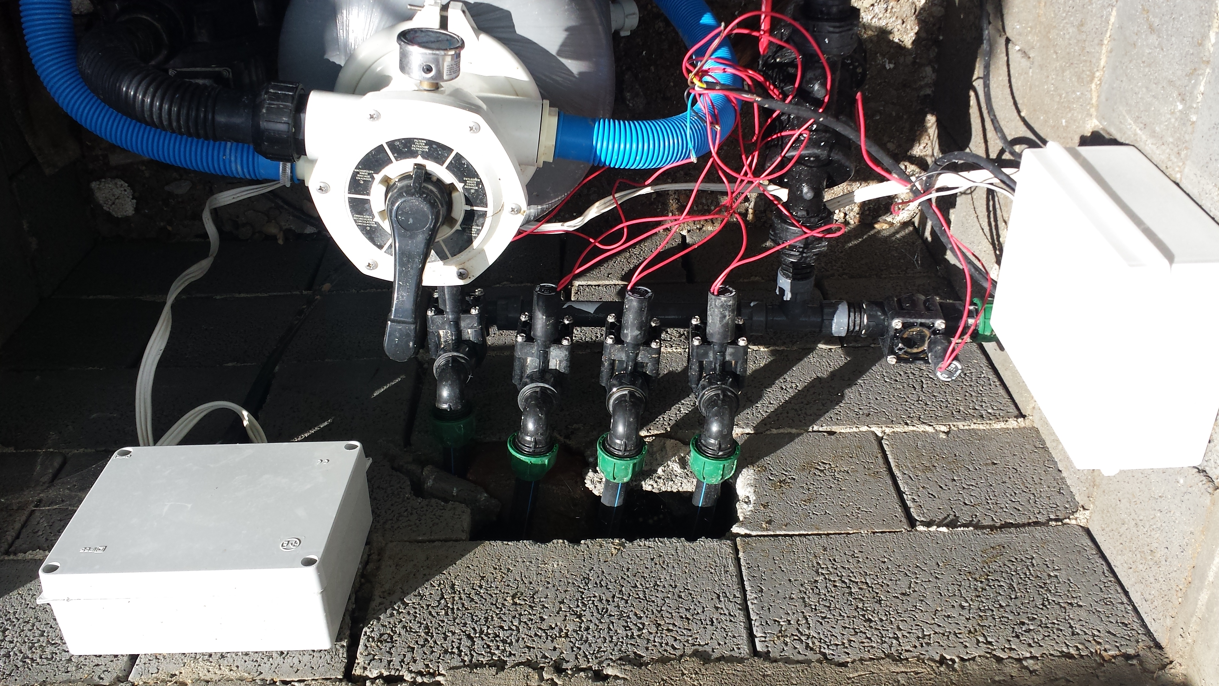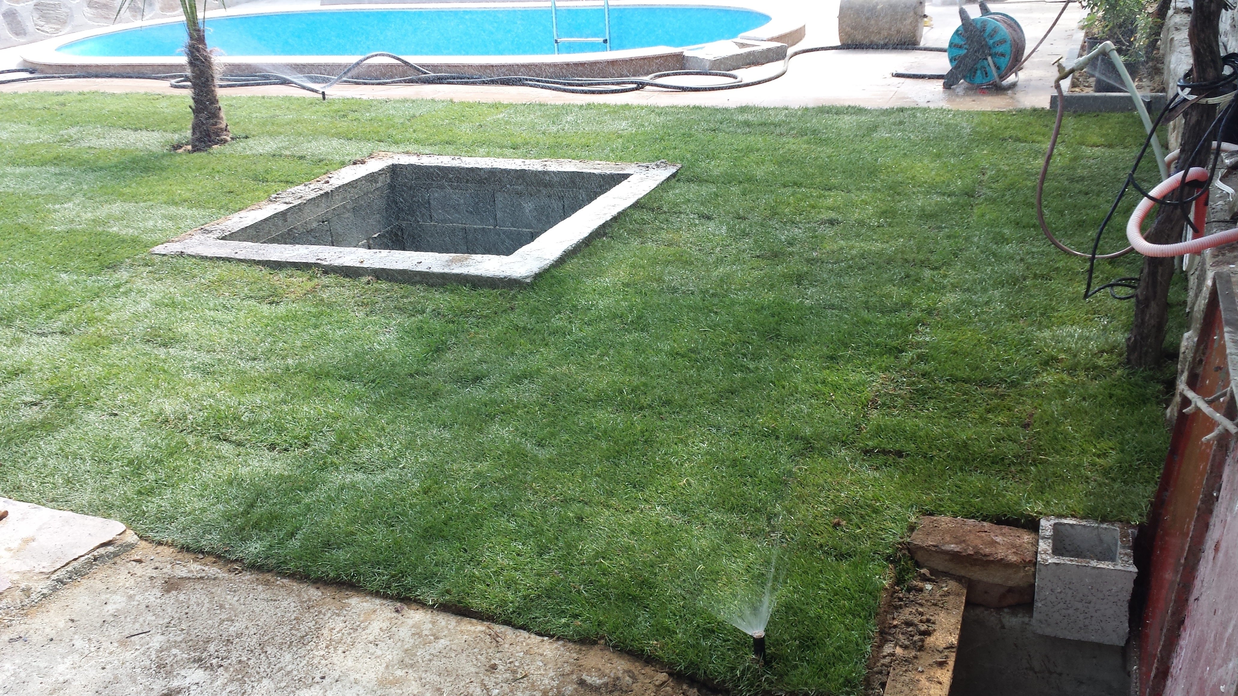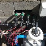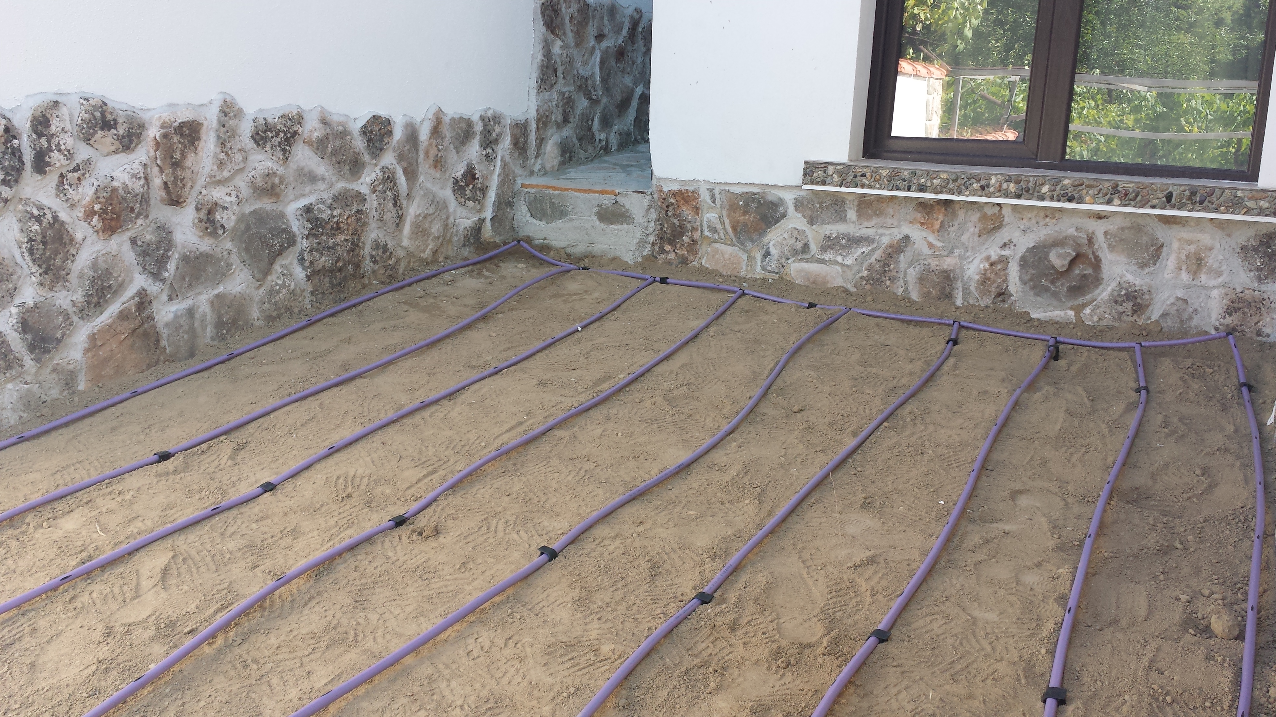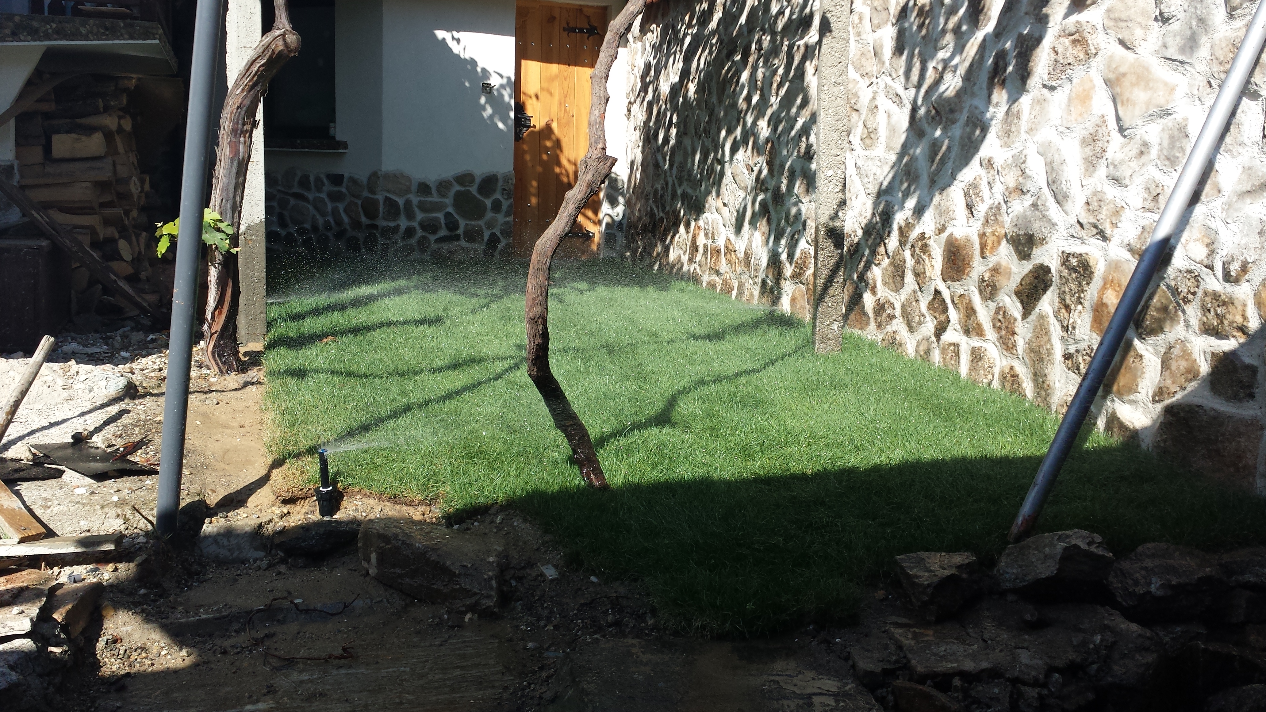 Напоителна система с пет работни кръга. Програматор “XC” на Hunter. Три кръга с разпръсквачи Pro-spray, един кръг с подземно капково и капково за напояване на зеленчуков сектор, както и декоративни растения. Един клапан е предвиден за пълнене и допълване на декоративно езеро.