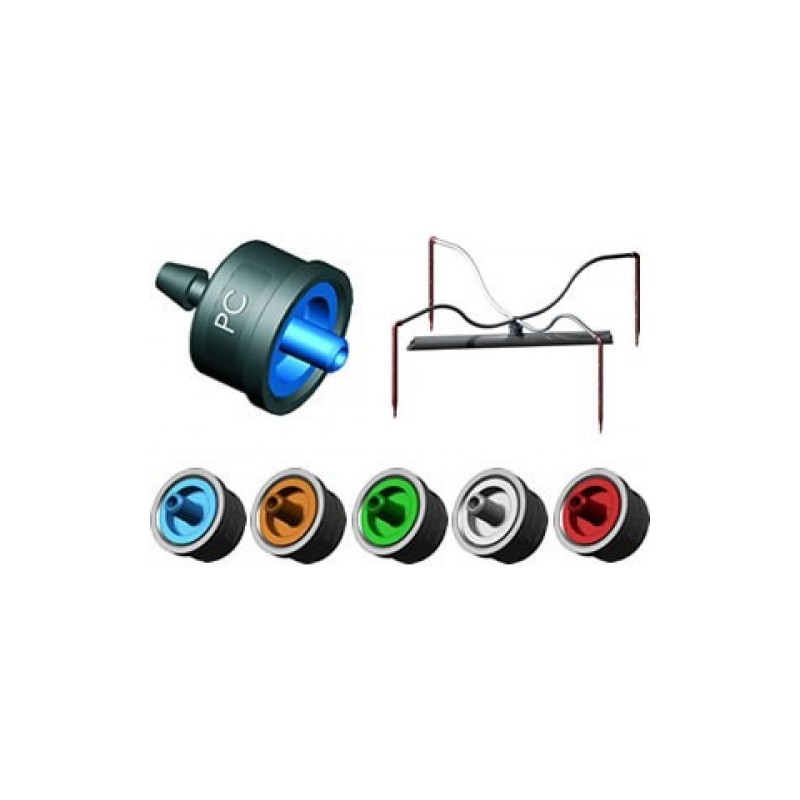Равномерен дебит от 0.6 до 5 бара. Идеален за реализиране на капкови напоителни системи с дълги редове или големи наклони. Подходящ за овощни градини, лозя, оранжерии, разсадници. Турболентен поток за предотвратяване на отлагания и запушване. Изработен от последно поколение полимери за дълъг живот и устойчивост на повечето химикали и торове. Цветна индикация за определяне на дебита. Работен обхват от 0,6 до 5 бара. Изход за микротръба (4 мм) или разпределители. Наличен със система „анти-капка“. Налягане на отваряне 0,4 бара. Налягане на затваряне 0,3 бара.
