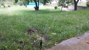 Напоителна система във вътрешният двор на жилищна кооперация в кв. Хаджи Димитър. Системата е свързана към водопроводната мрежа. Програматорът е X-Core с 6 кръга. Електромагнитните клапани са PGV-100. Разпръсквачите са Pro Spray с монтирани дюзи „MP Rotator“ на „Hunter“.