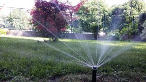 Поливната система е свързана към съществуващият програматор, който е модулен и сме го предвидили още при изграждането на напояването на останалата част от двора. Имаме един нов кръг с роторни разпръсквачи и един клапан захранващ водната площ.
