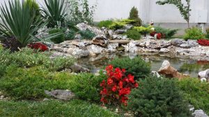 Декоративна водна площ изградена с PVC фолио. Водата се задвижва с помощта на потопяема помпа, пречистването става чрез филтърна система с UV лампа. Ултравиолетовите лъчи унищожават алгите, като по този начин се предпазва водата от позеленяване. Използваните материали са на немската марка „OASE“