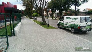 Малък двор в който затревяването го направихме с тревни чимове. Тъй като оградата е ниска, за да постигнем уединение на приземният етаж сме сложили вечно зелен жив плет от Taxus baccata, който е вечнозелен и има плътна текстура, която не само предоставя уединение, но и придава изисканост на целия двор.