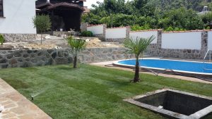 Поливна система изградена с материали на Rain bird и Hunter. Разпръсквачите са роторни PGP в комбинация с Pro Spray с роторни дюзи MP Rotator.