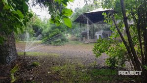 Разпръсквачите са на Hunter Industries. Роторните разпръсквачи са PGP и PGJ. А дефлекторните са Pro Spray с дюзи MP Rotator. Програматорът е X Core с 6 станции, а електромагнитните клапани са PGV 100GB.